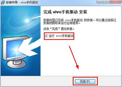 安装向导已完成vivo手机驱动的安装。可以通过选择已安装的图标来运行应用程序。