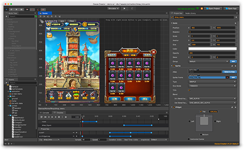 UI编辑器:用于编辑游戏中的所有的图形界面,主要使用人员是美术设计师。美术设计师可以将绘制好的界面图片资源导入到UI编辑器中,按照相应的设计方案来摆放、设计、编辑、拼接、修改相应的游戏图形界面。并将编辑好的UI资源直接整体导出,可以在游戏代码中直接呈现出来。UI编辑器支持Cocos2d-X的全部的控件,并进行了扩充。满足了游戏开发中对各种UI控件的需求。UI编辑器支持碎图导出、整图导出、UI模板、UI动画等实用功能。