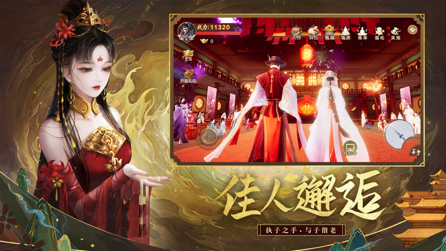 3、美术画面升级,全力还原古风结缘。醇酒新婚,千人来贺,凤冠霞帔,万人来朝。让你与你的道侣成为仙侠世界里令人羡慕的眷侣。