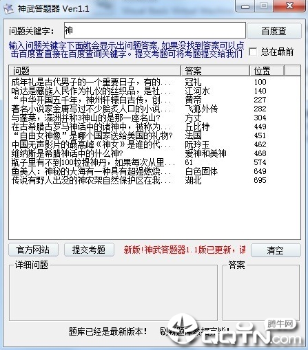 答题器是由奇游软件开发的一款神武答题免费辅助工具,神武答题器内置了近千题考题,并且提供快速搜索功能,玩家只需输入游戏问题关键字,马上就会自动跳出问题答案,帮助玩家在神武答题活动中获得满分。