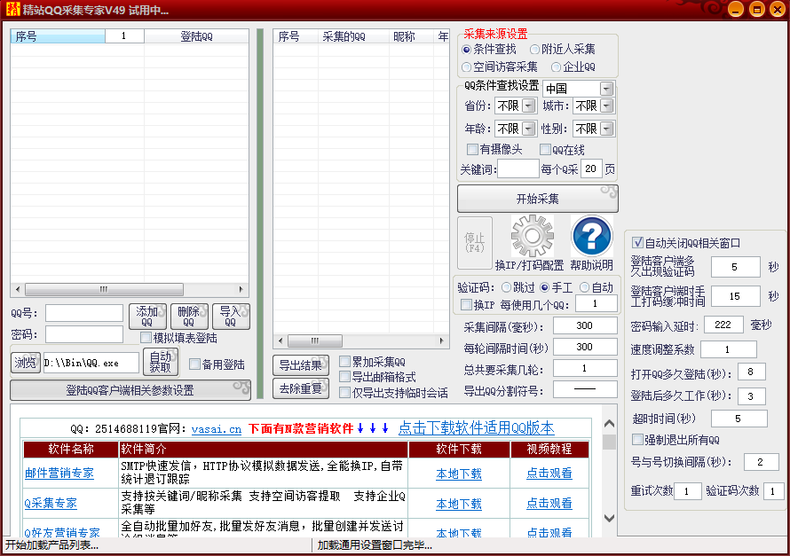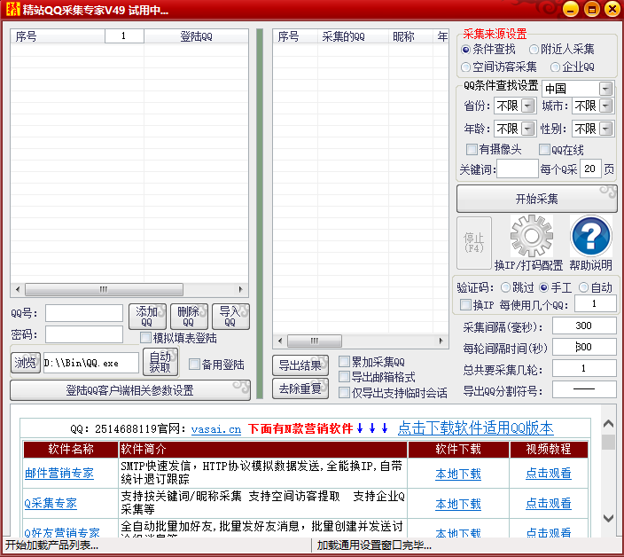 专门采集Q号码的软件,可采集支持临时会话Q,可按条件进行采集,可提取Q空间访客,可以采集企业Q等等,获取的Q可以使用系列软件如邮件营销、批量发消息等软件进行定向营销!
