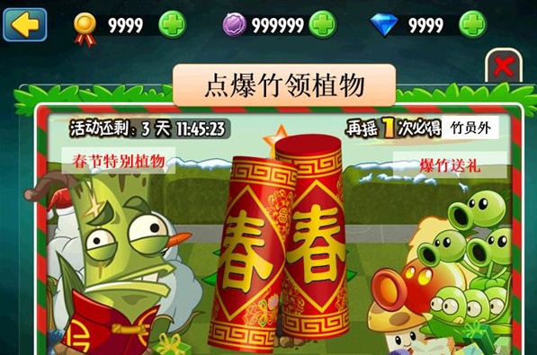佳节临近,喜庆的气氛笼罩,游戏为玩家们准备了一系列活动。2月签到即送机枪石榴,坚持每日签到还能获得专属装扮和进阶机会。通过每日登陆、挑战财神和猜灯谜即可赢取大量红包,更可领取中国春节限定植物竹员外。还有新植物三阶植物每日送每日换活动。福利满满、实惠多多!