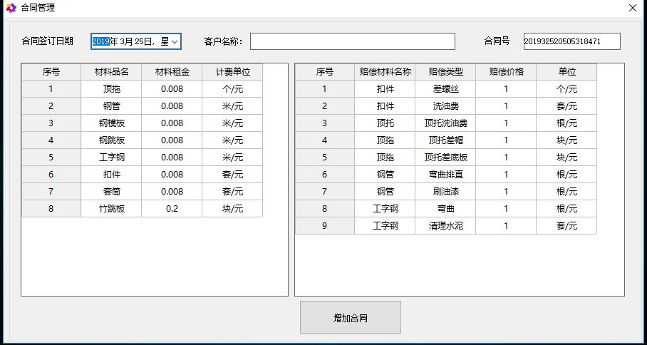 11、物资丢失赔偿处理:系统自动访问合同出租、回收单据,并自动显示各种物资的欠收数量,操作者确认后,自动做丢赔处理、并冲减库存物资的自有数量!
