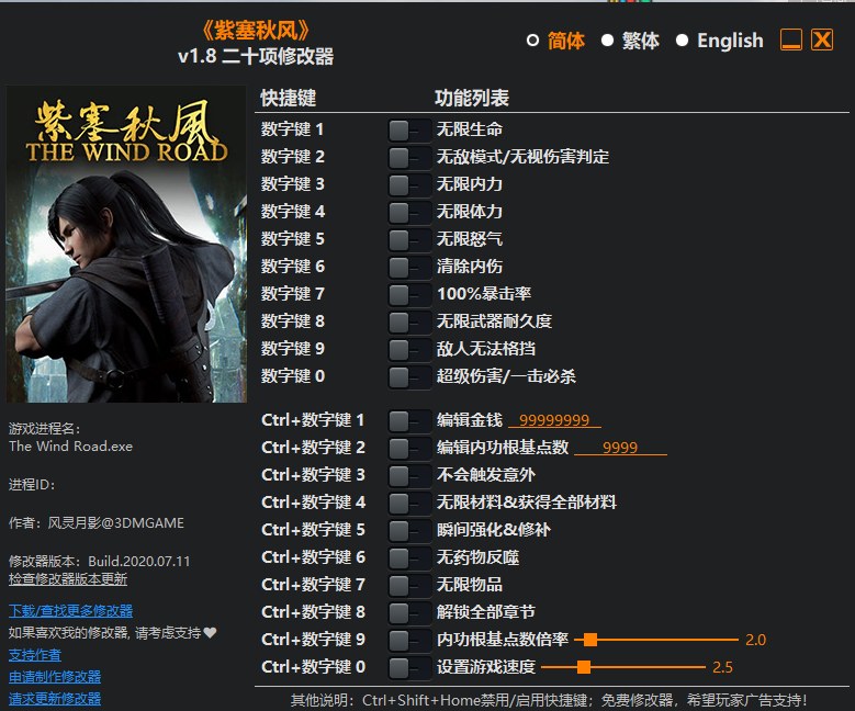 二十项修改器是由风灵月影带来的最新的紫塞秋风的修改器,能够为玩家们提供多种强力游戏属性,让玩家的游戏难度降低得到更加好的游戏体验,感兴趣的玩家不要错过了,欢迎下载使用!