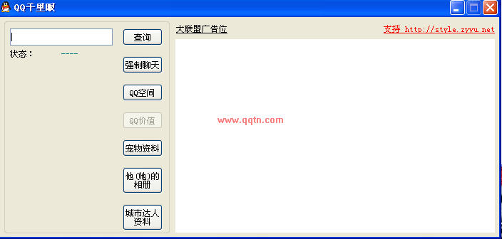 可以不用登陆QQ且不用加为好友查询QQ号码的工具,支持强制聊天、查看QQ空间、评估QQ号价值、查询QQ资料等功能。