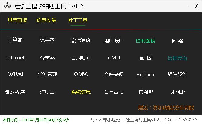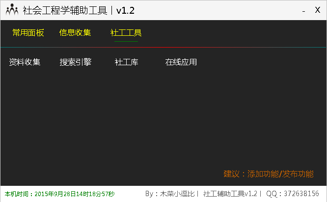 社会工程学辅助工具提供了常用面板、信息、社工工具三项功能栏,每个功能栏中又有非常的常用工具,特别是社工工具栏中,相关专业小软件超多超实用,是社工人员必备百宝箱。