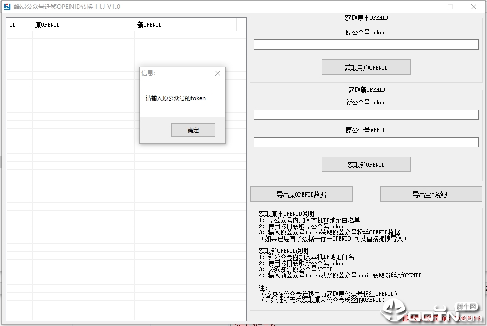 酷易公众号迁移OPENID转换工具,因为公众号迁移很麻烦,所以自己写了个软件获取到粉丝的新OPENID,去修改数据库以前OPENID,必须在公众号迁移之前获取原公众号粉丝OPENID,开始迁移无法获取原来公众号粉丝的OPENID,欢迎下载使用。