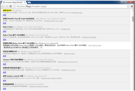请在地址栏输入chrome://flags/#enable-npapi回车,出现以下界面