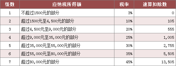 工资、薪金所得,适用七级超额累进税率,税率为百分之三(3%)至百分之四十五(45%)。