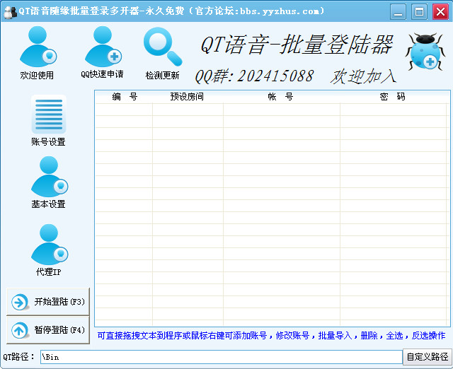 QT语音随缘批量登录多开器就是这样一款免费纯净的QT账号多开器,通过本程序,你可以实现自动上号、自动进频道,并能挂出独立IP的效果,大大的缩减了用户手动操作需求。本程序承诺永久免费。