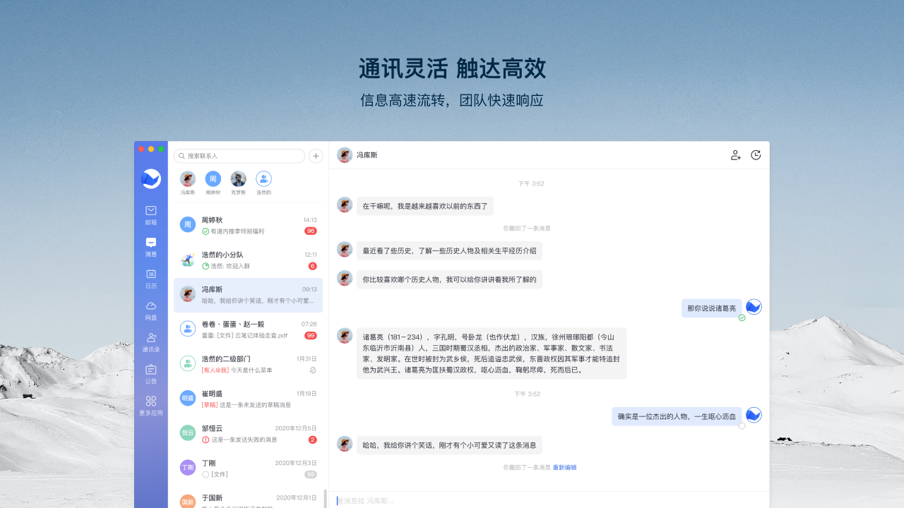 将办公中使用率极高的在线文档、云盘、邮件与即时沟通打通,使信息高速流转,团队快速响应,极大地提升了协作效率。