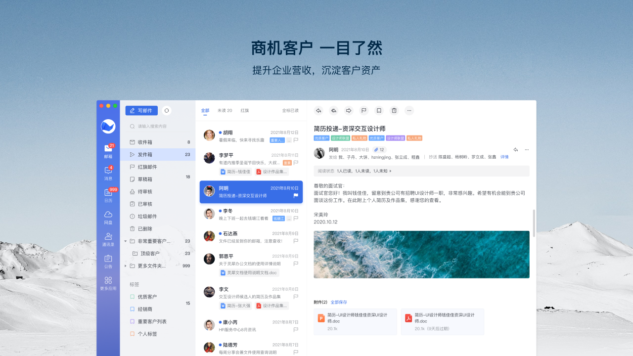 可聚合查看与客户所有往来邮件,通过标签清晰管理企业级客户信息。