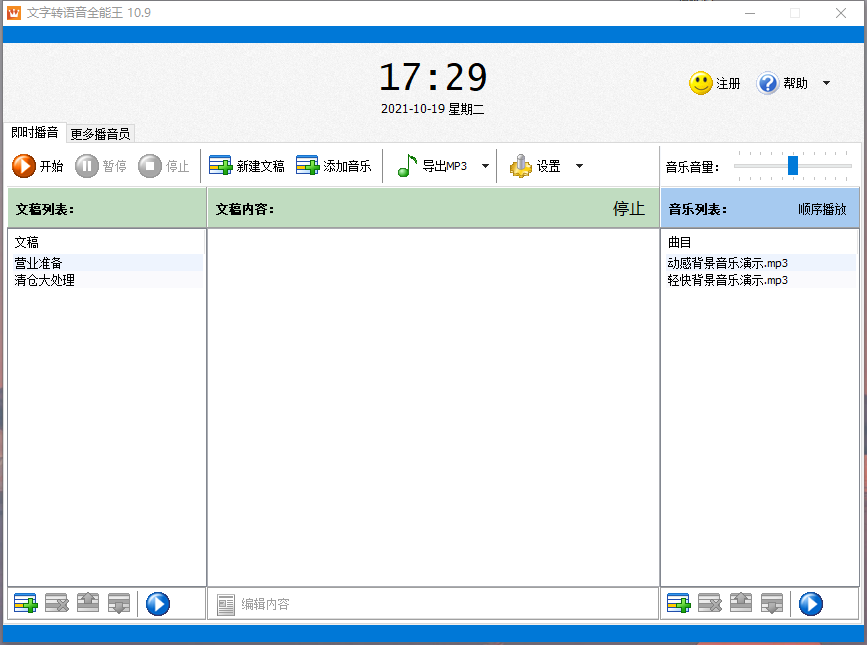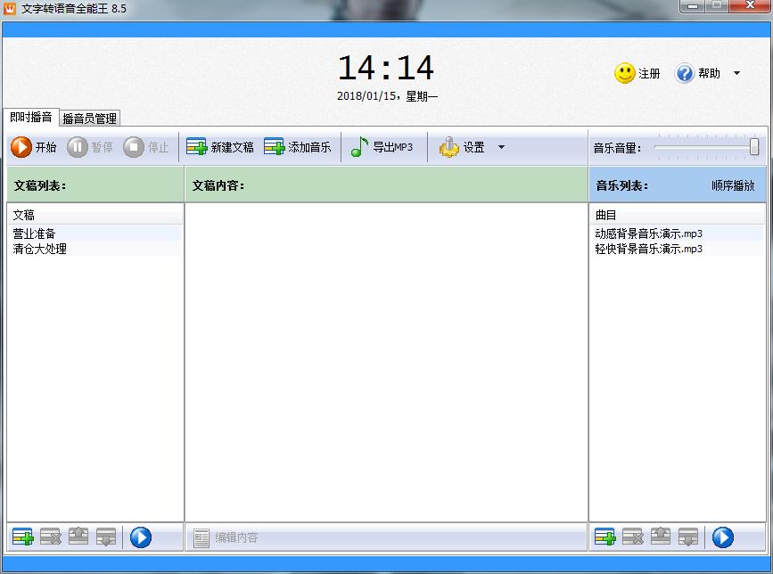 7,在播音过程中可以创建新的播音稿,可任意切换播音内容和背景音乐,整个播音过程完全由您掌控,随心所欲
