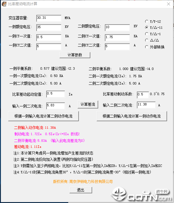 可以输入变压器的容量、电压等级、CT一次和二次值,自动计算系数和额定电流,输入保护定值参数