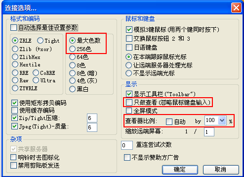 屏幕监控默认显示质量是256色的,缩放比例是80%,可以点击屏幕监控窗口的工具栏的第三个小按钮,调出“连接选项”对话框,更改设置,如下图:
