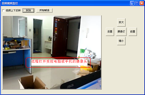 连接成功后,出现连接对话框,有很多功能按钮,点击“声音摄像头监控”按钮,远程打开受控电脑的摄像头: