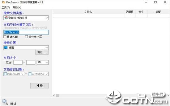 DocSearch是一款十分方便的文档搜索工具。能够轻易的帮助用户搜索到自己想要的文本文档文件,可批量在文档中查找指定关键字,支持任何最新版本的文档文本Office,让你的效率成倍提高,需要的用户赶快来试一试吧!