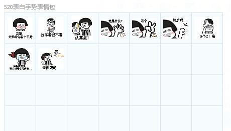 520表白手势表情包是由小编为大家整理出的qq表情包聊天应用。这款表情包里面装的可不是你所想象到的甜蜜浓浓的情侣暧昧表情哦,完全是用来装逼使用吧!比较适合单身的小伙伴使用哈!谁说520这天,一定要虐死单身狗的,小编这款表情包吗,可是救了单身的童鞋们!