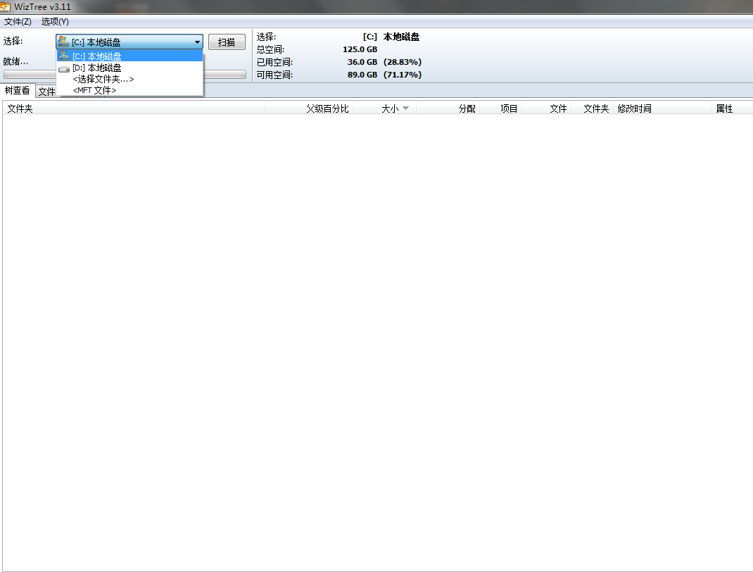 2、界面中会使用目录树方式把文件夹从大到小排列,并且还会显示占用百分比、占用空间、文件数量、子文件夹数量等信息;