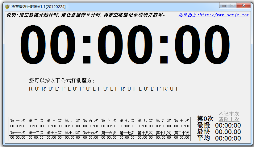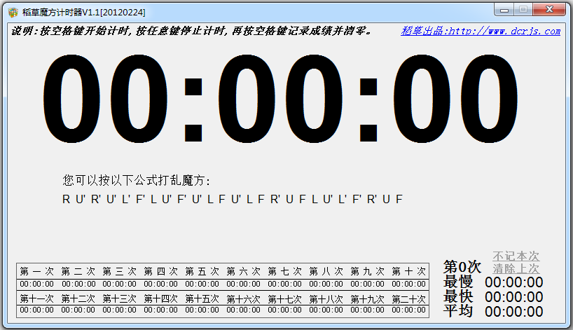 稻草魔方计时器是一款可以帮助用户计时的软件,该软件使用方便,操作简单,可以记录20次计时的时间,用户只需按空格键即可开始计时,按任意键即可停止计时,再按一次空格键即可记录成绩并且当前计时时间清零。