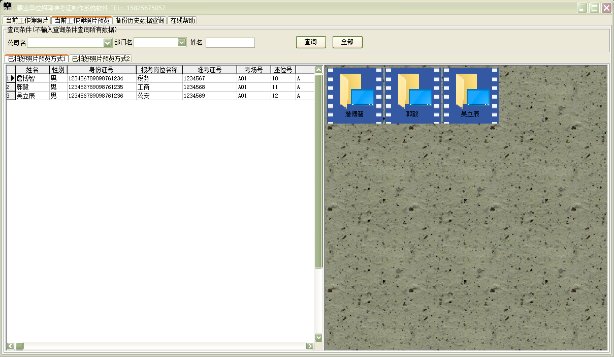 事业单位招聘准考证制作系统是一款适合企事业单位使用的应用软件,可以帮助用户轻松制作并且打印招聘准考证,使用简单,导入相关照片系统即可自动批量生成转考证,大大提高了工作效率,节约了劳动力成本。是准考证制作的好帮手。