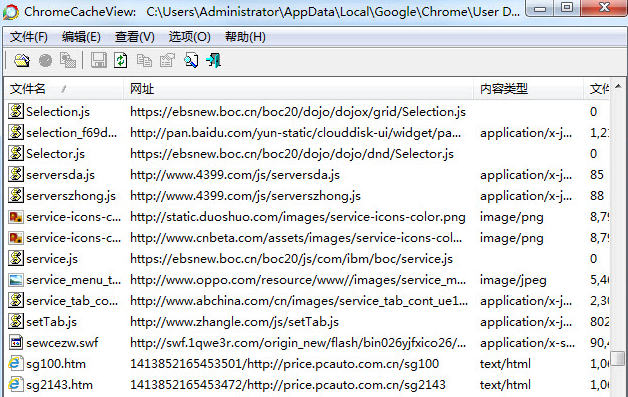 ChromeCacheView 是一个小巧的读取Google Chrome浏览器缓存目录的工具,可以以列表显示所有当前缓存的文件,每个缓存文件都包含以下信息:URL,内容类型,文件大小,最后一次修改时间,最后获取时间,过期时间,获取总计,服务器名称等等。