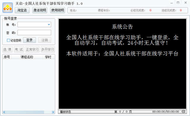 全国人社系统干部在线学习助手是一款由天启软件打造的适用于全国人社系统干部在线学习平台的学员们学习使用的辅助学习工具,支持一键登陆、全自动学习、自动考试等,且24小时无人值守!