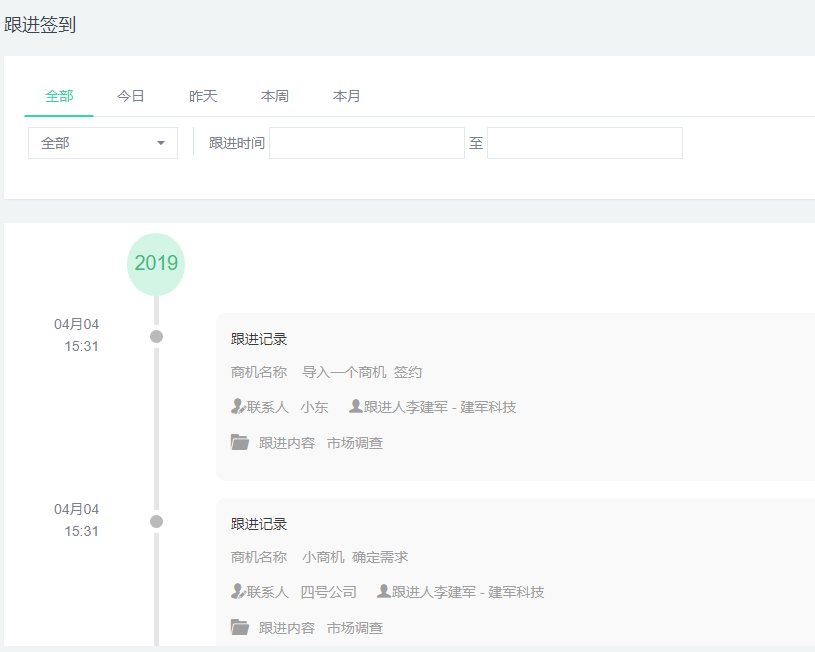 在 我的工作台 —跟进签到 可以查看跟进记录。