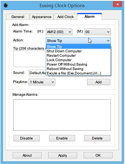 4、而 Eusing Clock 还具有提醒功能,你可以设置在特定时间内作出不同的提醒,譬如向弹出一个信息框、关机、重启电脑、锁定电脑、又或者是运行某些程序等等
