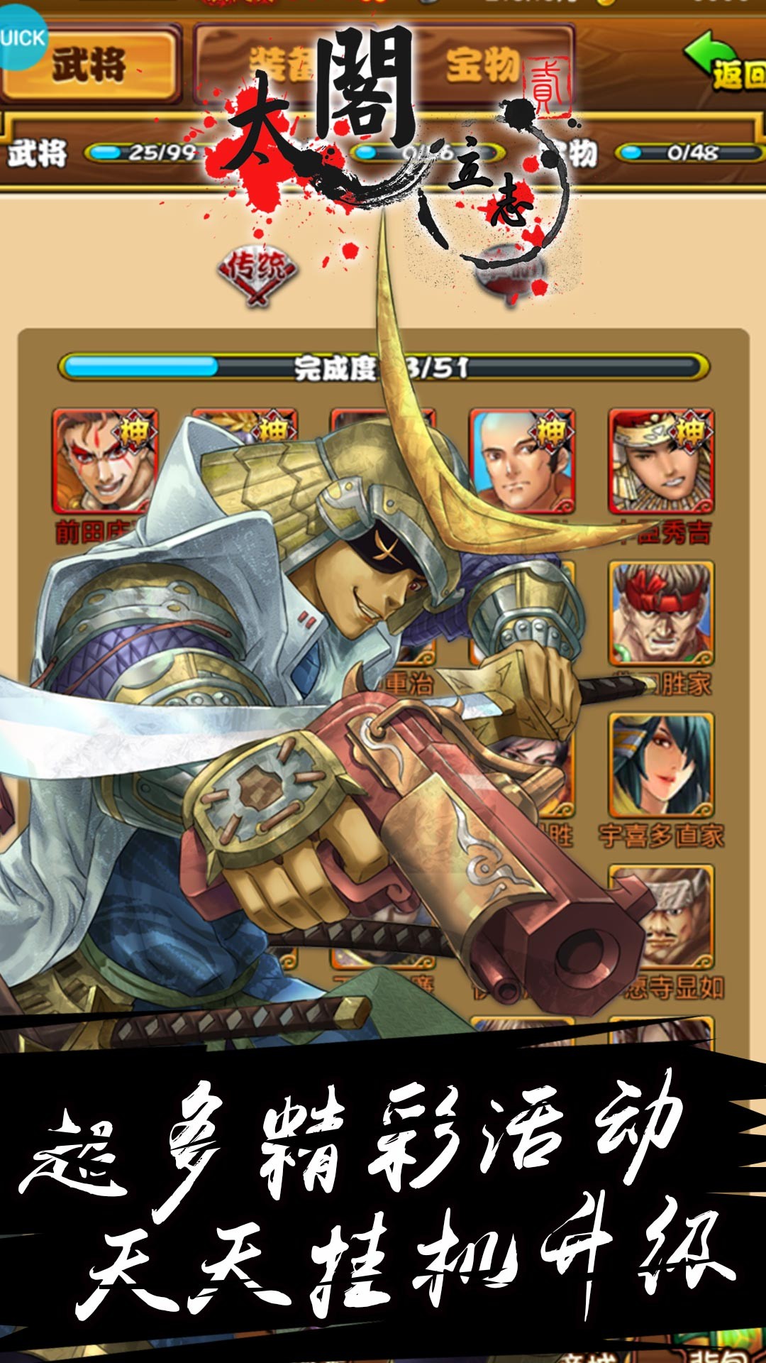 游戏以日本战国时期的故事为背景,充分展现中各种大小人物的坎坷经历,需要玩家自己搭配英雄角色,结合游戏内的各种规则制霸战国,上线就送1w5金判。