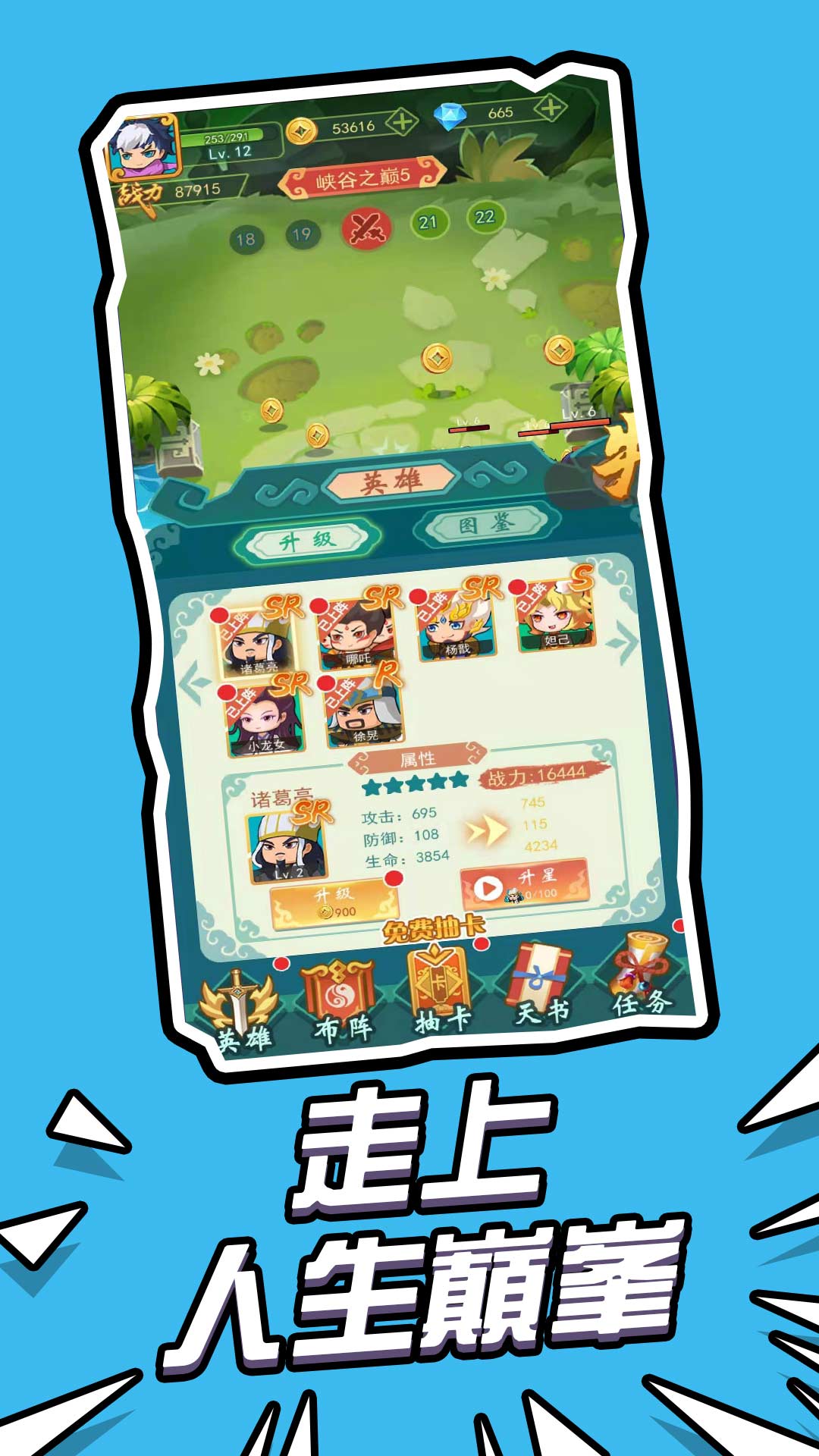 通过上阵不同武将,通过武将的合理配置进行,若闯关失败还可以通过提升武将等级,升星等方法来进行过关。BOSS关卡更有丰富奖励等待玩家来获取。