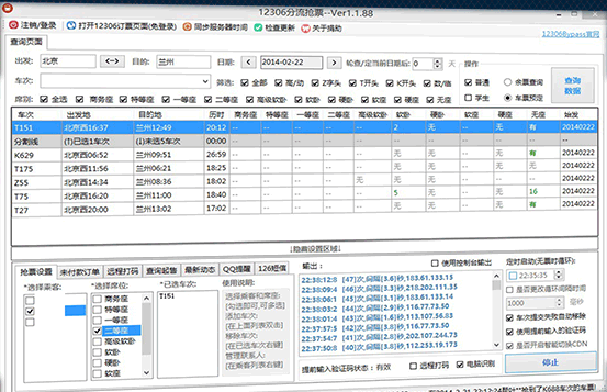 添加车次:在查询结果的列表内双击车次,或者右边的预定按钮,或者划选区域的车次,点击右键,全选车次也在右键。