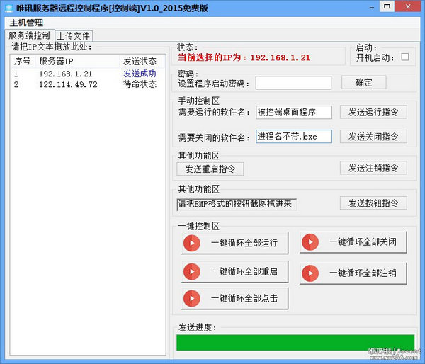 唯讯服务器远程批量控制端程序是一款免费的易用的Server批量控制软件。该软件包括唯讯服务器远程批量控制端和唯讯服务器远程披批量被控端。通过该软件,用户可以方便的控制多台服务器,而且有些服务器上的软件经常卡死或者需要经常重启机器的,可以用这个软件批量操作。