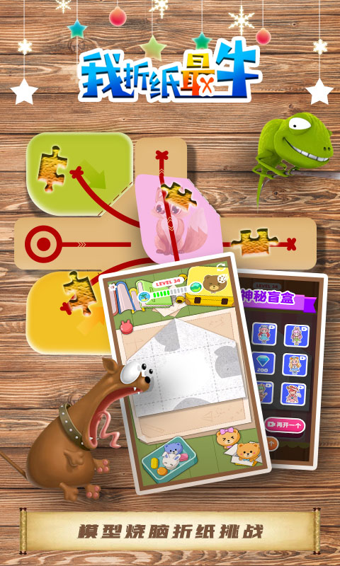 我折纸最牛,一个在手机端可以模拟折纸的游戏,按照虚线提示,用自会的头脑来分辨折纸顺序,不仅考验你的空间想象力,还有记忆力,即使完全不会还有游戏提示告诉你,解锁更多的折纸内容,完成目标物品吧。