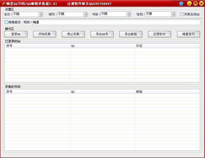 嗨星QQ号码邮箱采集器可以按地区年龄性别分类批量采集QQ号码和QQ邮箱,非常稳定实用。目前还没有同类软件能够达到如此之高的提取效率,绝对是广大QQ人员的必备软件。