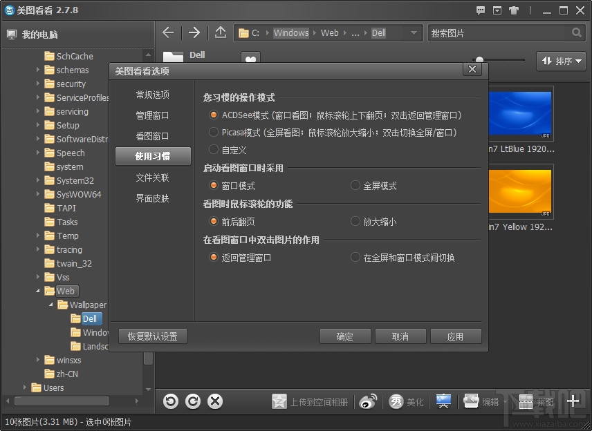 打开选项卡选择里面的使用习惯选项,对看图时鼠标滚轮的功能进行设置为前后翻页即可(如下图)。