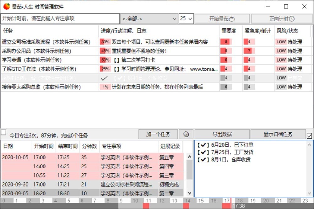 番茄人生是一款时间管理软件,一款Windows PC端待办事项软件,最重要的,它是一个番茄工作法时钟,它最小化在Windows任务栏中仍是一个番茄时钟,显示窗体时,它的专注时间条,帮助用户提升完成任务所产 生的成就感,鼓励用户坚持继续完成剩下的番茄。