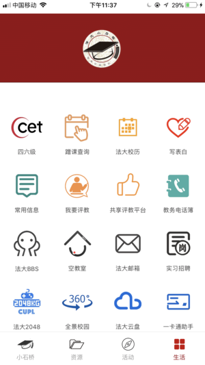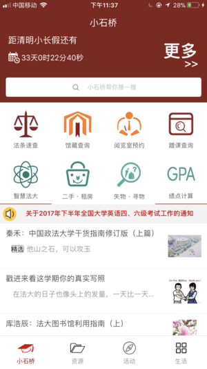 法大小石桥app首次将学校官网、教务处、图书馆等网站转码为便于在手机上浏览、与官网同步更新的,专用中国政法大学的校园应用,对法大的童鞋来说,这个程序还是有点小方便的。包含图书馆预约、选课、校园卡充值等多方面的内容,是每一个在校学生必不可少的工具。一个将学校成绩查询、、学习资料等功能集于一体的应用软件,如果你在校园内部丢失财物,也可以直接在此平台上发布失物招领。