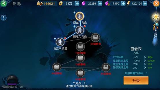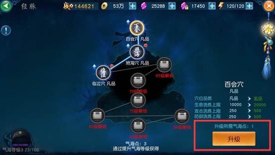 在穴位总览界面,点击左下角的气海槽,可以打开穴位升级界面。玩家可以使用气海点升级穴位品质,穴位品质由低到高共有5个等级:凡品、玄品、地品、天品、魔品。穴位品质升级后,其携带属性可以洗炼的上限会增加。