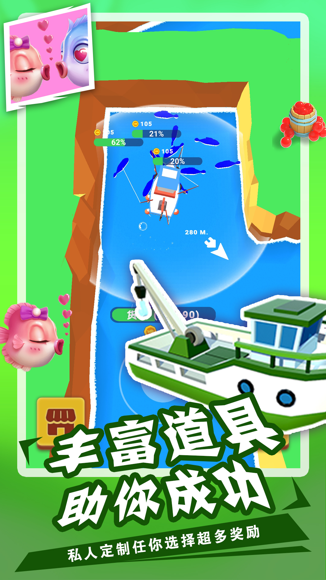 模拟捕猎3D,一款超治愈的休闲卡通钓鱼游戏。游戏真实模拟钓鱼环境,各个鱼类等你解锁,各种鱼竿、钓饵等获取,驾驶船只出海钓鱼,满载收获而归。