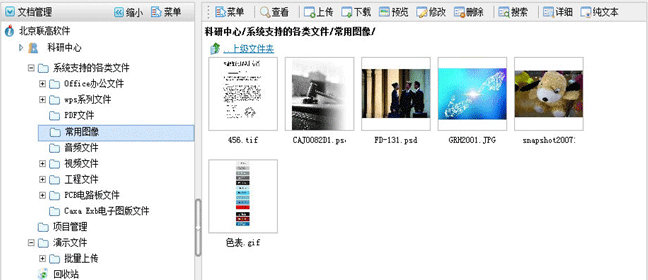 提供“详细”,“缩略图”,“列表”三钟浏览方式, 自动显示缩略图、签出人、文档摘要等信息。