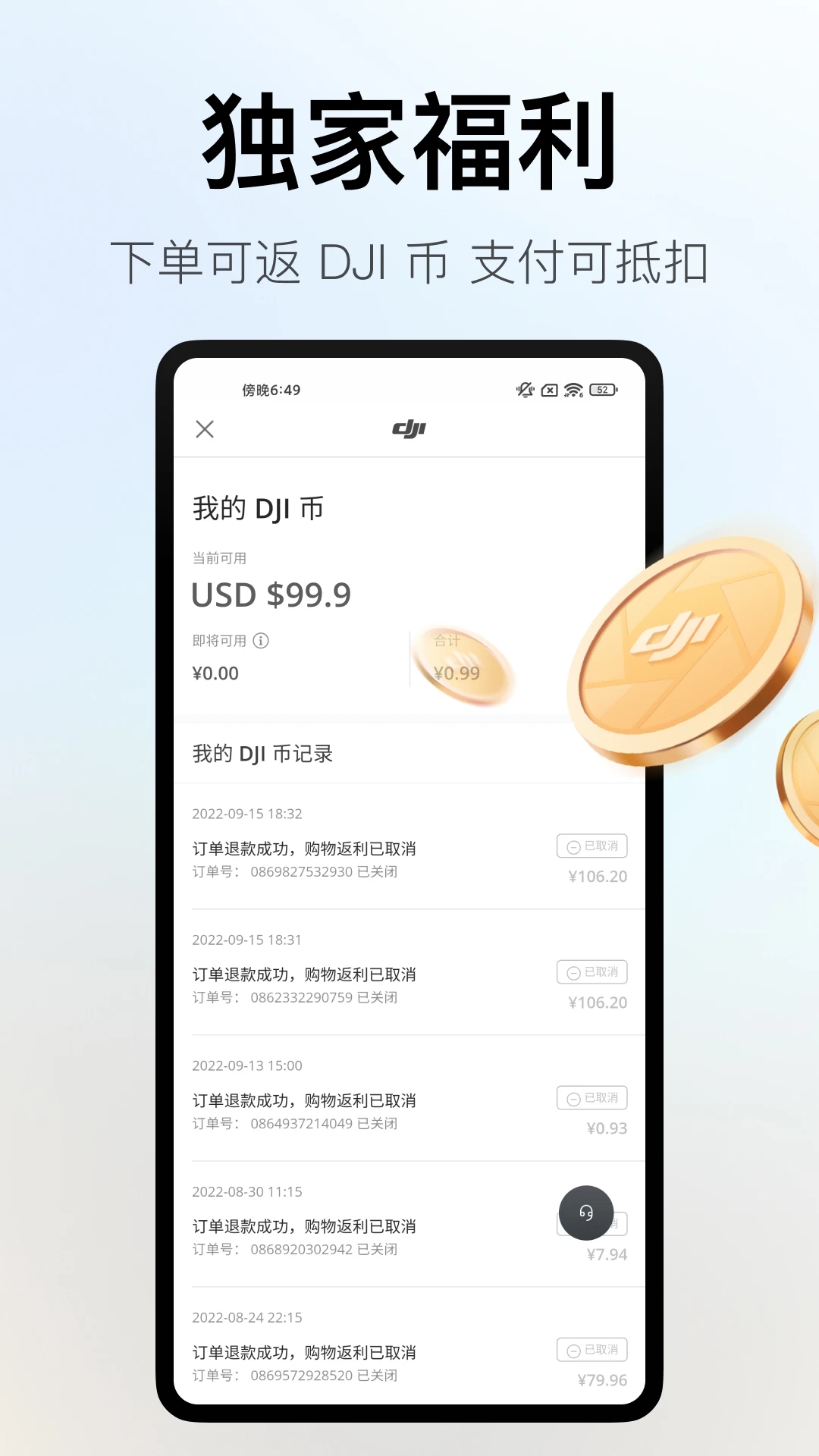 1. 返 DJI 币,可用于支付商城内任意订单。