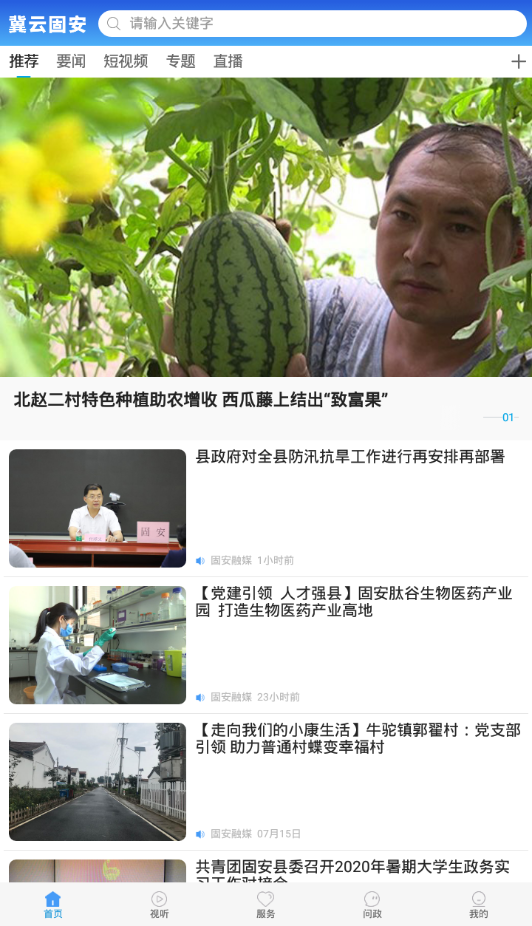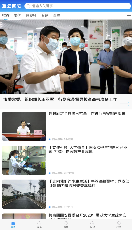 冀云固安app是当地的新闻服务的软件平台,在这里可以查看到当地的最新最全面的资讯消息,为用户带来了优质的新闻阅读服务,还有当地的政务服务可以在这里进行办理服务,为用户带来了优质便捷的生活服务,每天都会进行资讯的更新,用户之间还能在这里进行交流互动,足不出户就能知道当地的大小事情。