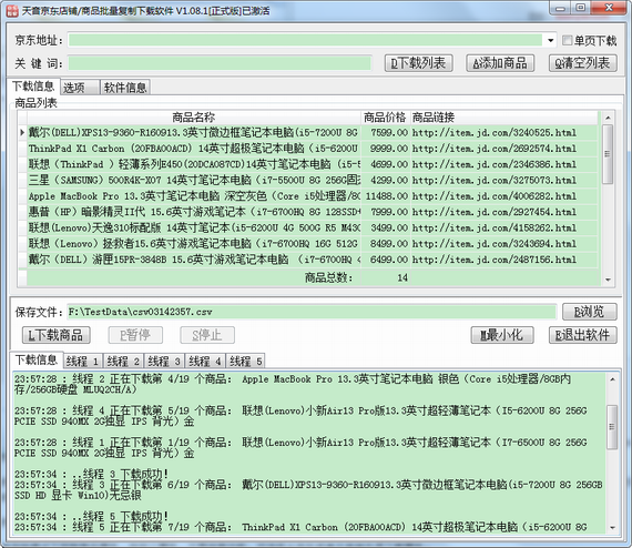 -支持下载任意京东店铺(普通店铺、QQ商城)首页、所有商品、商品分类、店内任意搜索、单个商品、京东搜索、商城搜索地址;店铺首页地址可自动识别并跳转;可以选择从第几页到第几页下载;可以设置只下载单页,该功能可采集店铺首页所有窗口的商品(包括推荐商品);已下载过的京东地址在软件内部管理,方便下次查找和下载;支持批量添加商品地址下载功能。