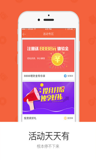 【活动丰富】:用户可参与诸多平台新手或定期的活动,理财金、新手红包、及加息活动,活动多多,奖励多多!