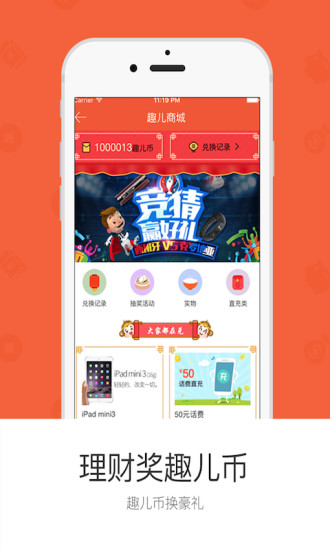 【趣儿币换豪礼】:通过签到,投资等行为获取的趣儿币可以兑换或抽取多种礼品,手机充值卡、蓝牙耳机、iphone SE 等等,只有想不到,没有兑不到~
