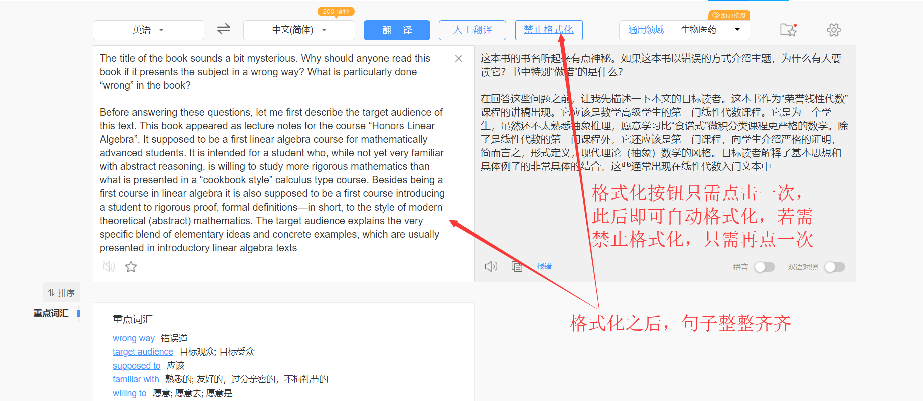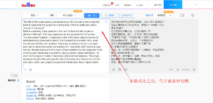 在谷歌翻译、百度翻译、网易有道翻译、的页面上增加了一个“自动/禁止格式化”按钮,用来自动移除从PDF等复制过来的文本中包含的换行、回车