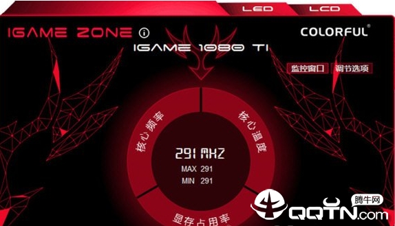 主页面默认圆环居住,显示核心频率,核心温度以及显存占用率,从上往下依次为当前,最大及最小。软件同时支持LCD及LED的调节,如显卡无上述调节功能,按钮默认隐藏。