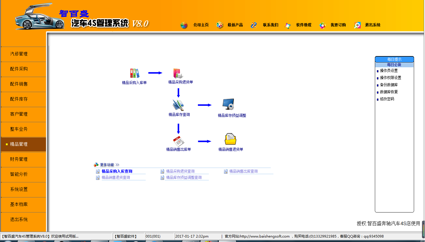6.精品管理:精品管理主要用于汽车4s店中的精品配饰管理,功能包括精品采购入库单、精品采购退货单、精品库存、精品销售等,对精品的销售和采购实现统一管理、统一采购。