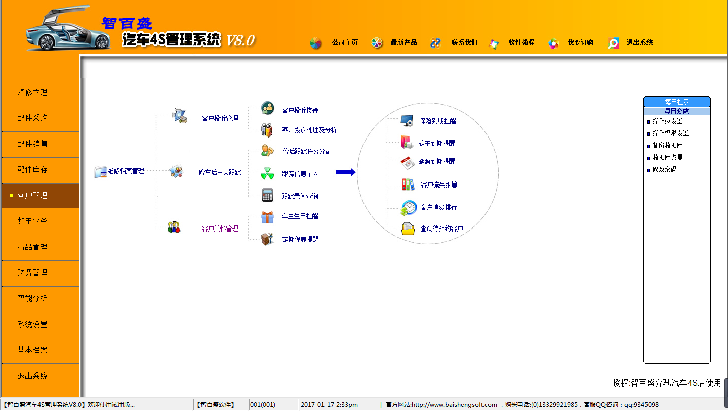 预约, 回访, 投诉, 调查、问题、处理意见以及客户满意度多种跟踪方式, 可自由设定进度, 满意度, 方便分析客户类型,并制定不同的客户管理方针;提供多种客户分析查询, 图形化分析, 一目了然;潜在客户转正式客户, 方便客户管理;正式客户回访, 可自由设定根据客户回访, 根据车辆回访;回访信息汇总; 日常提醒(客户生日、会员到期日、代办业务到期等提醒)